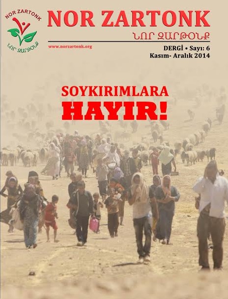 Nor Zartonk dergisinin Kasım-Aralık 2014 tarihli 6. sayısını; emperyalistlerin, Türkiye ve Suudi Arabistan gibi işbirlikçileri ile palazlandırdığı IŞİD’in, Rojava’da halklara karşı giriştiği soykırımlar arifesinde yayımlıyoruz. Türkmenlere, Asuri Süryanilere, Ermenilere ve Ezidilere soykırım uygulamaya çalışan IŞİD, bugün Kobanê’ye var gücüyle saldırıyor. Türkiye ise sınır koridorunu açmayıp tampon bölge isteyerek, işgalci planlarını bir kez daha gözler önüne seriyor.